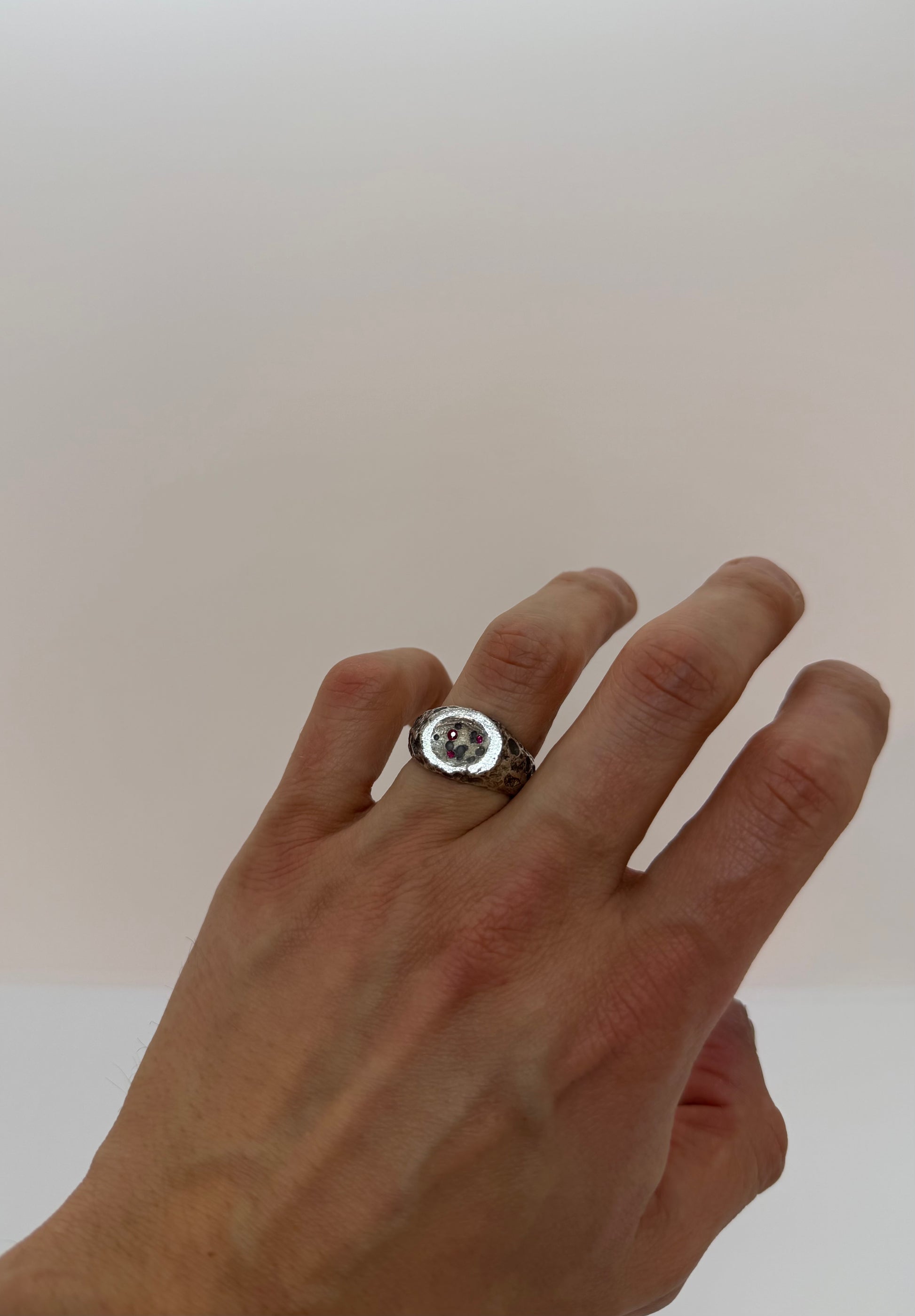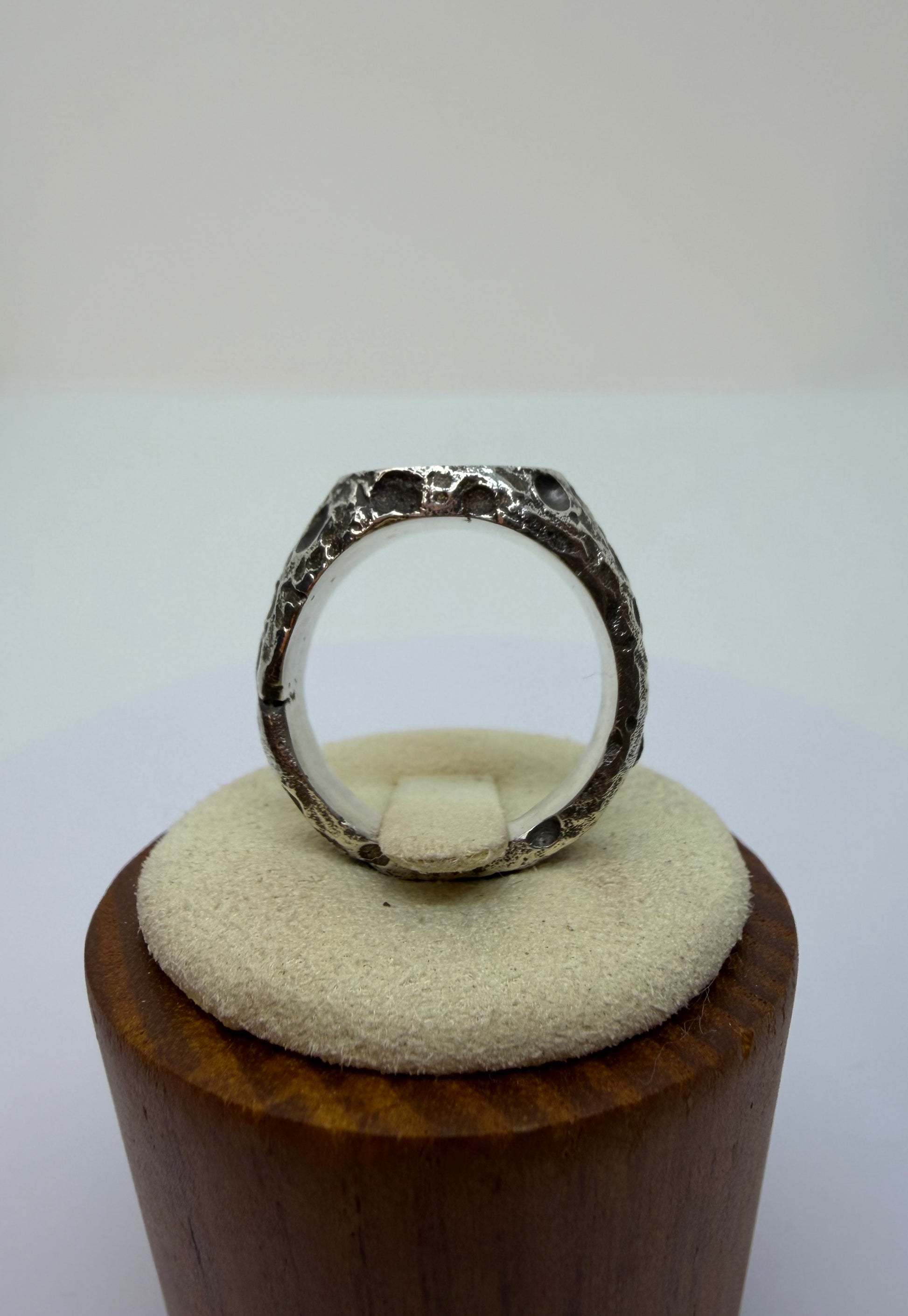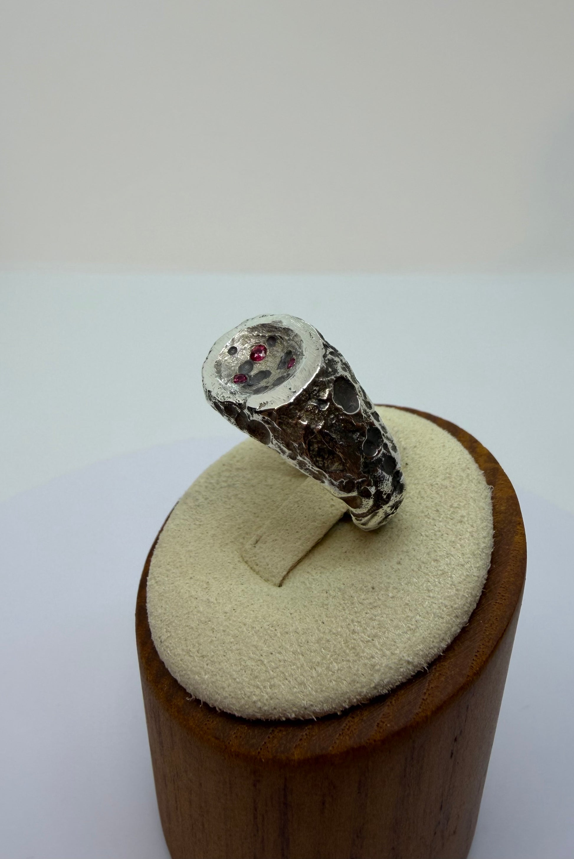 Dieser handgefertigte Ring aus massivem 925er Sterling Silber ist inspiriert von antiken Relikten und mystischen Himmelserscheinungen. Die strukturierte Oberfläche erinnert an die raue, zerklüftete Landschaft des Mondes, während die drei tiefroten Rubine an einen Blutmond erinnern. Das Design verbindet historische Eleganz mit moderner Handwerkskunst – ein einzigartiges Statement-Piece für alle, die außergewöhnlichen Schmuck lieben.