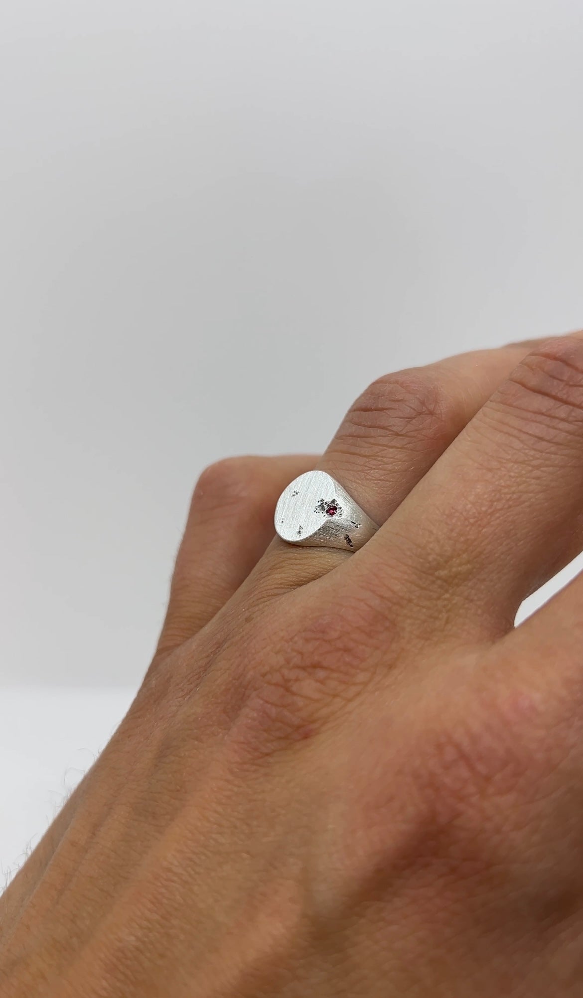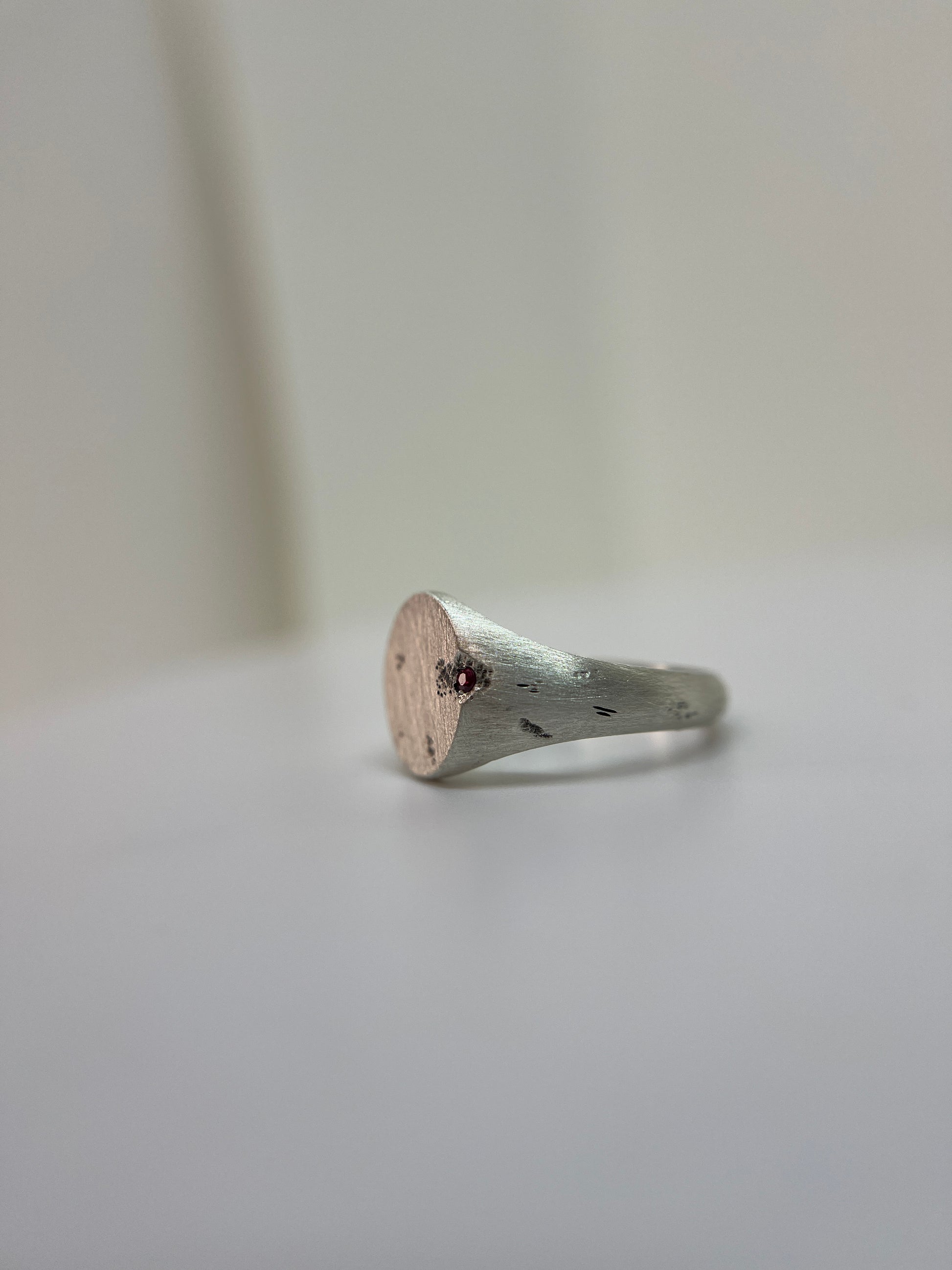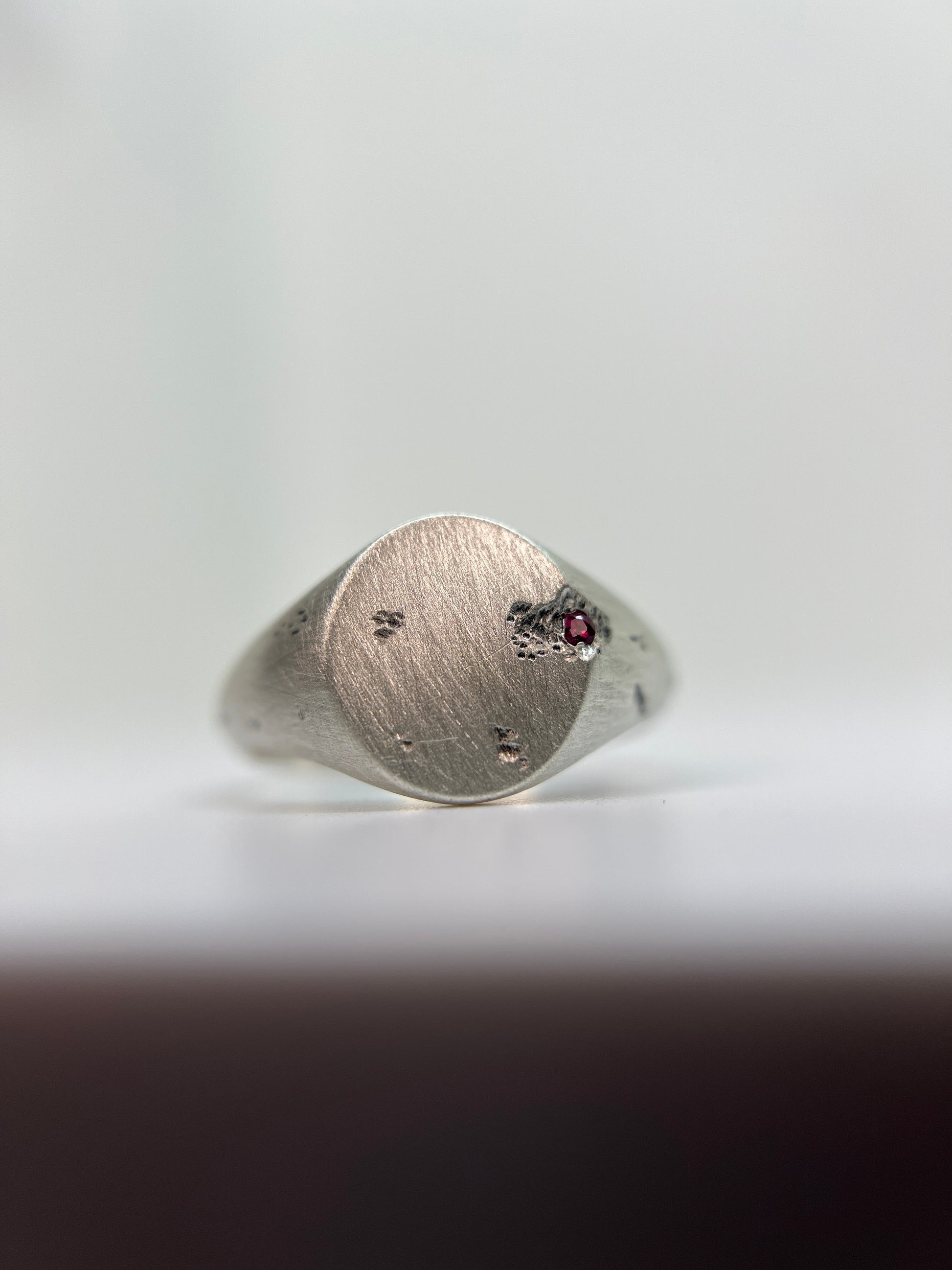 Der handgefertigte Ring „Crater Ruby“ besticht durch seine minimalistische Form und seine feinen, bewusst unregelmäßigen Strukturen. Die leicht angeraute Oberfläche erinnert an eine ruhige, mondartige Landschaft – durchbrochen von einem einzigen, eingefassten Rubin von nur 1,3 mm Größe, der wie ein verborgenes Glutlicht aufblitzt.