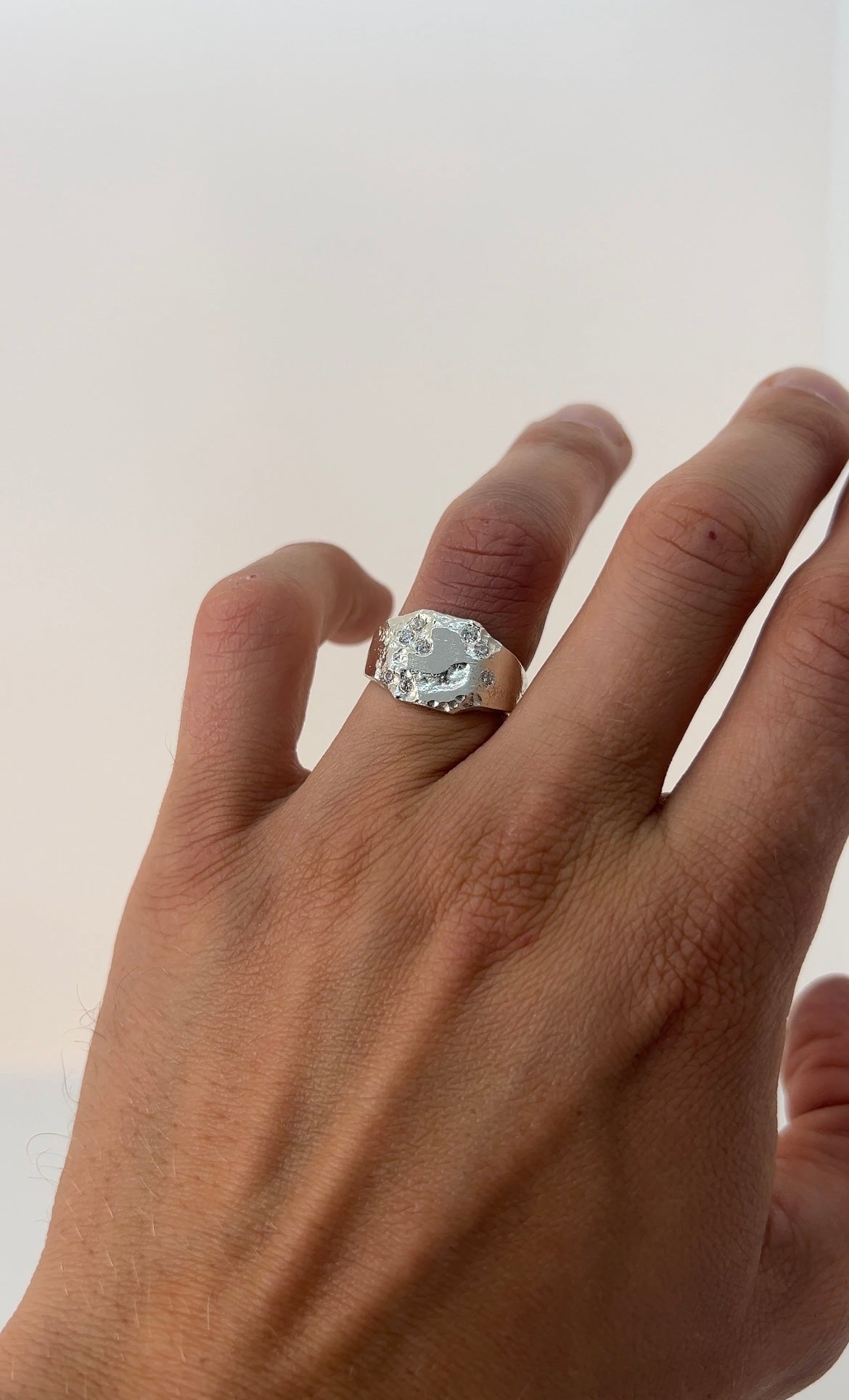 Der handgefertigte Ring „Crystal Shards“ aus massivem 925er Sterling Silber verbindet rohe Strukturen mit funkelnder Eleganz. Die markante, hochglanzpolierte Oberfläche zeigt eine organische, unregelmäßige Form, die durch 8 eingefasste Zirkonia-Steine (je 2 mm) verstärkt wird. Das Zusammenspiel von Glanz und rauer Textur verleiht dem Stück eine unverwechselbare, fast skulpturale Ausstrahlung.