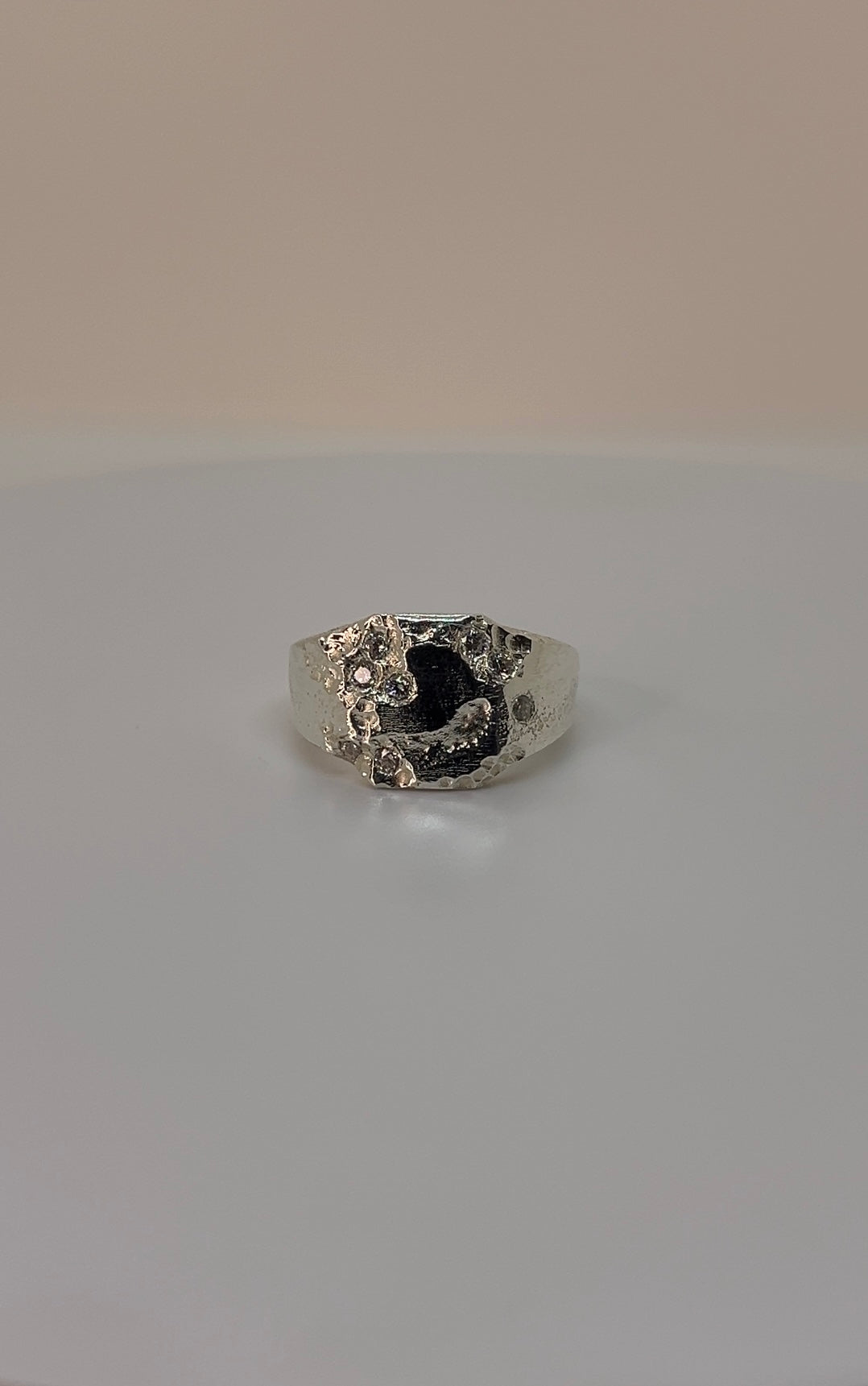 Jeder einzelne Stein bricht das Licht auf seine eigene Weise und bringt die Tiefe der Struktur zum Strahlen – ein Kontrast, der den Ring zu einem echten Blickfang macht.